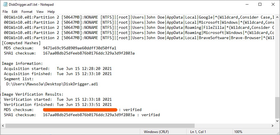 md5sum <disk-image>.ad1for linux, orcertutil -hashfile <diskimage>.ad1 md5for windows.