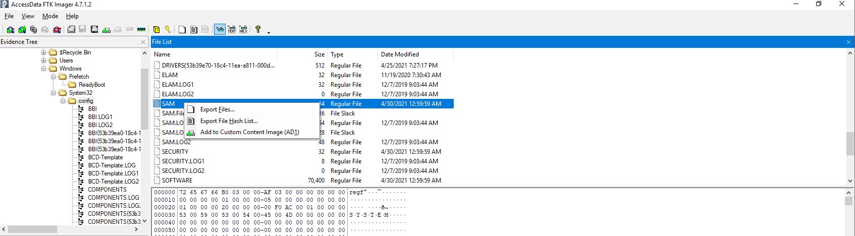 To achieve this, we have to export the windows registry file “SAM” and “SYSTEM” which are located in C:\Windows\System32\config\.