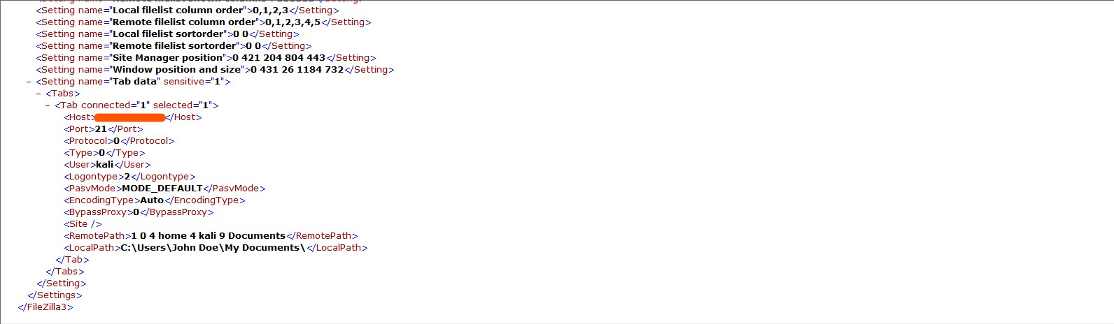 By looking at C:\Users\John Doe\AppData\Roaming\FileZilla\filezilla.xml, I saw an interested xml tag which describes the information about connected server including, host, port, protocol, type, and so on.