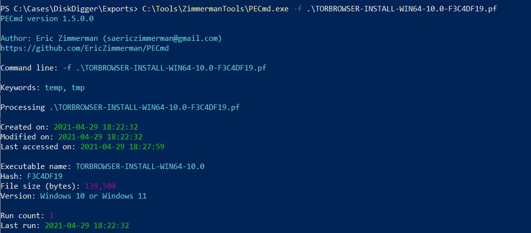 By using PECmd.exe from Zimmermantools you can see the result show that the program hasn’t run yet. The prefetch we have seen previously was the installation process. However, to confirm the truth I used PECmd.exe to analyze the exported prefetch file to whether it is an installation prefetch or not.